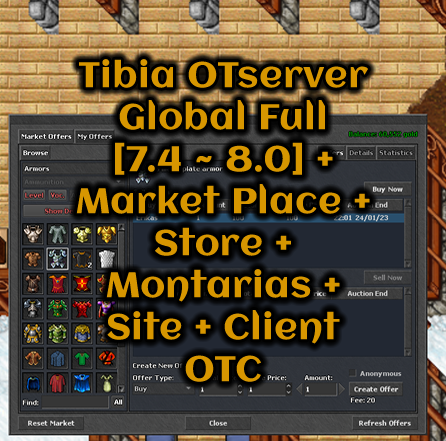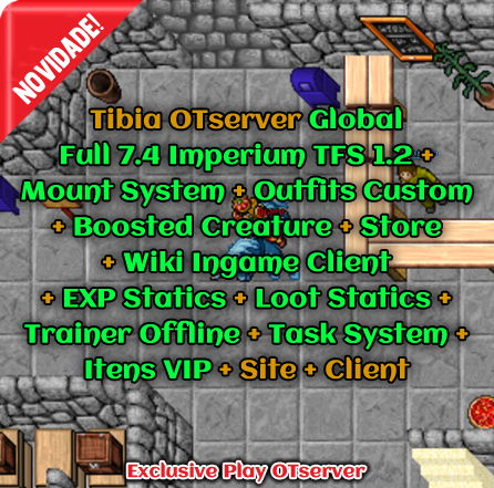 TFS 1.0 + Mount System + Outfits and Mounts 13x + Market System + Store System + Sprites Exclusivas + Boosted Creature + Party Shared EXP + Task System + Monster Loot on Screen + Itens VIP + Stackable Items + Trainer Dummy + House Scroll + Temple Scroll + Lottery System + Backpack Custom + Decoration Itens Exclusives + Site + Database + Client + Mobile + Editores