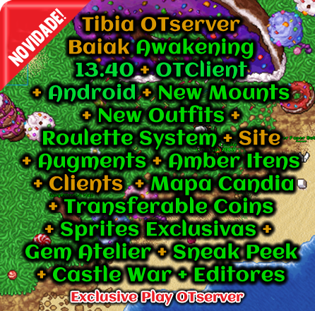 OTClient + Android + New Mounts + New Outfits + Roulette System + Augments + Amber Itens + Mapa Candia + Transferable Coins + Gem Atelier + Sneak Peek + Castle War + Sprites Exclusivas + Site + Clients + Editores