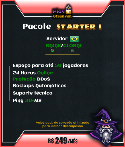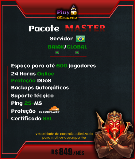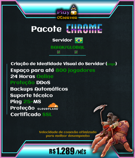 Desenvolvimento de Logo; Espaço para 500 jogadores; 24 Horas Online; Proteção DDoS; Backups Automáticos; Suporte Técnico; Ping 25~MS; Proteção CLOUDFLARE