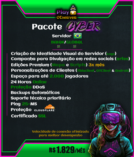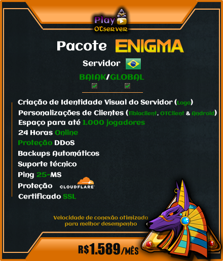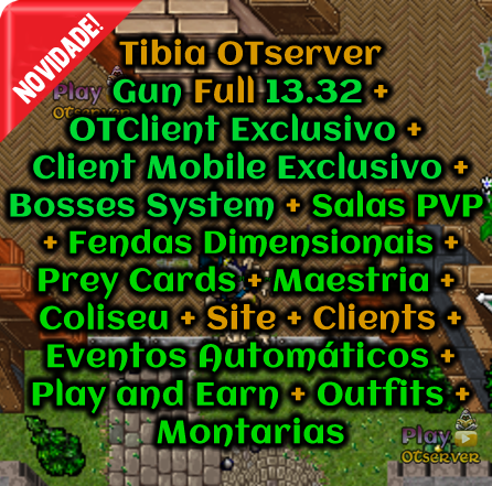 OTClient Exclusivo + Client Mobile Exclusivo + Bosses System + Salas PVP + Fendas Dimensionais + Prey Cards + Maestria + Coliseu + Site + Clients + Eventos Automáticos + Play and Earn + Outfits + Montarias
