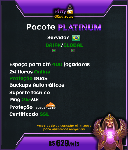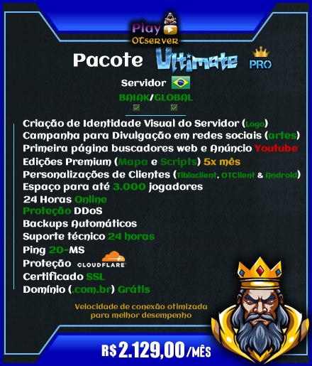 Desenvolvimento de Artes; Edições Premium (Mapa e Script) 3x Personalização de Clients; Desenvolvimento de Logo; Espaço para 2.000 jogadores; 24 Horas Online; Proteção DDoS; Backups Automáticos; Suporte Técnico; Ping 25~MS; Proteção CLOUDFLARE