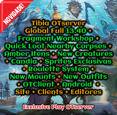 Fragment Workshop + Quick Loot Nearby Corpses + Amber Itens + New Creatures + Candia + Sprites Exclusivas + Roulette System + New Mounts + New Outfits + OTClient + Android + Site + Clients + Editores